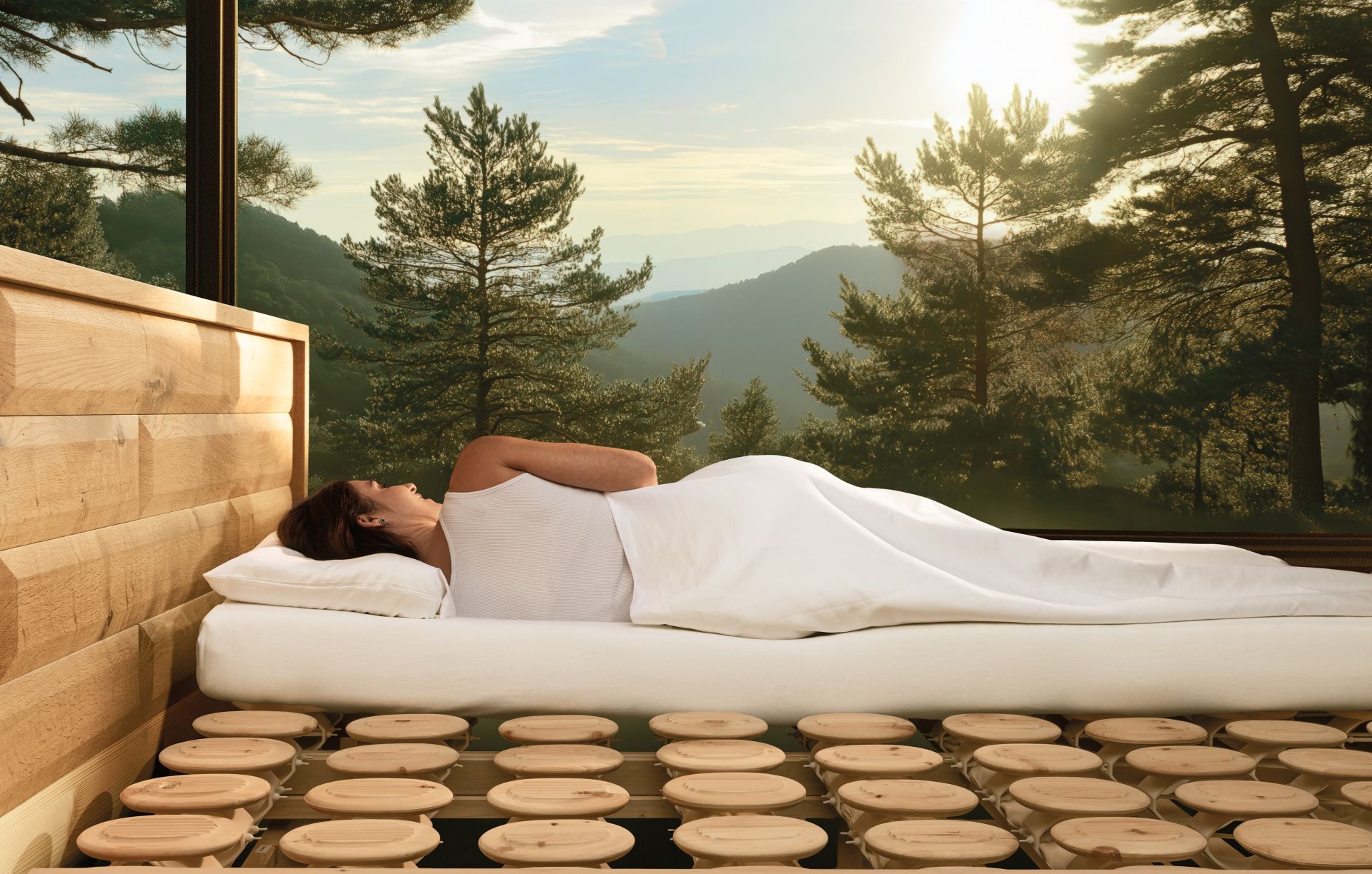 Zirbe, Buche oder Kiefer – stabile, langlebige und vollständig metallfreie Konstruktion für ein nachhaltiges, robustes und wohngesundes Schlafsystem.